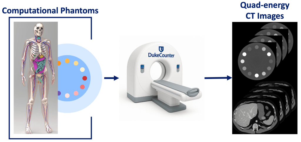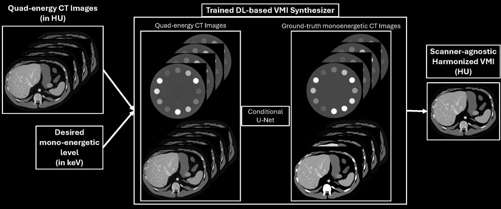 By integrating realistic, physics-informed in silico simulations with a conditional U-Net architecture, the model learns spectral-spatial relationships that allow accurate and continuous mono-energetic image synthesis across energy levels. DL-synthesized mono-energetic images show strong quantitative agreement and structural fidelity with ground-truth data, maintaining inter- and intra-scanner consistencies.